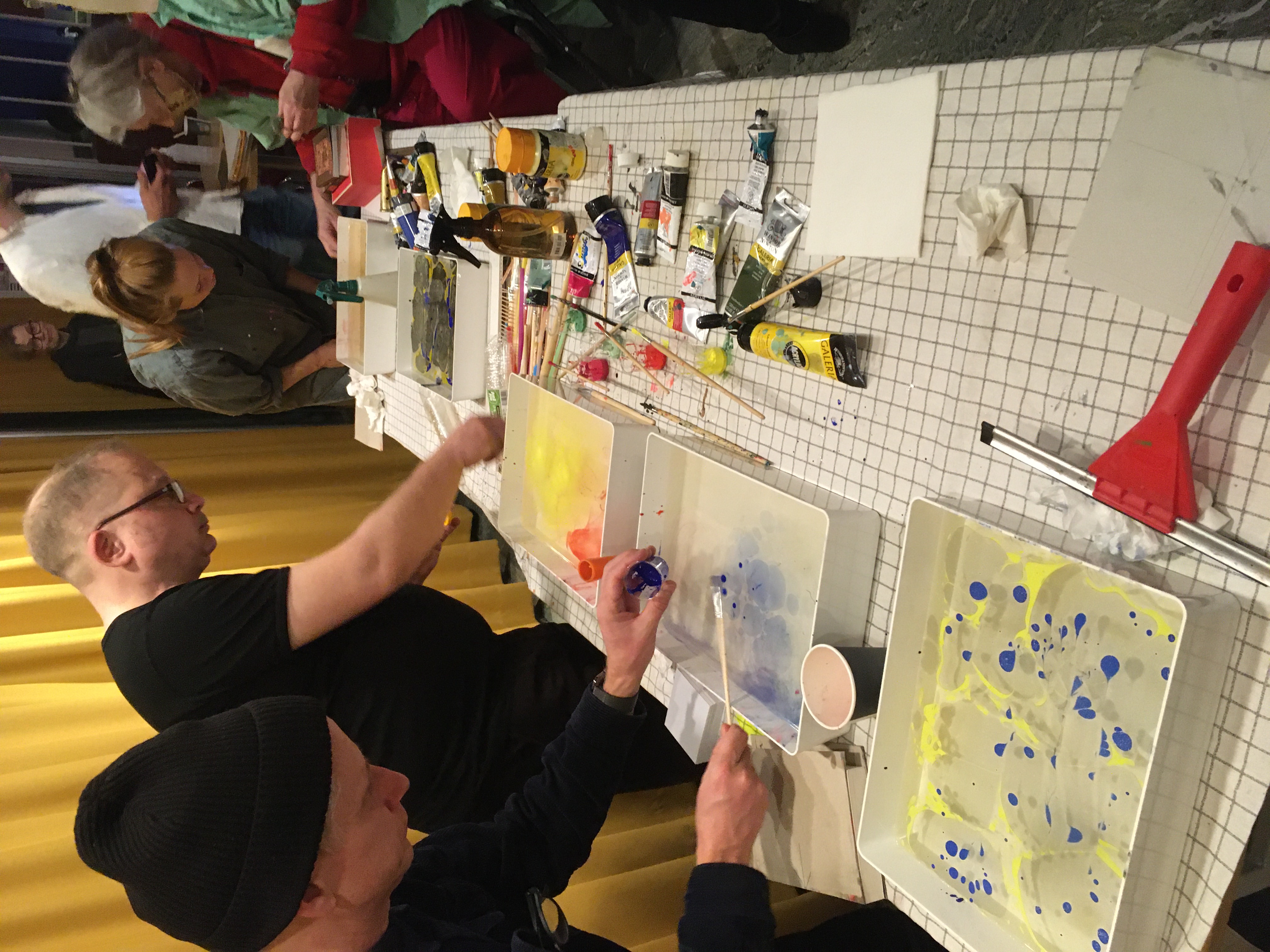 Paper marbling workshop and talk about the book The Natural Enemies of Books: A Messy History of Women in Printing and Typography. Part of a book design course for BA1 students organized by lecturer Jens Schildt.